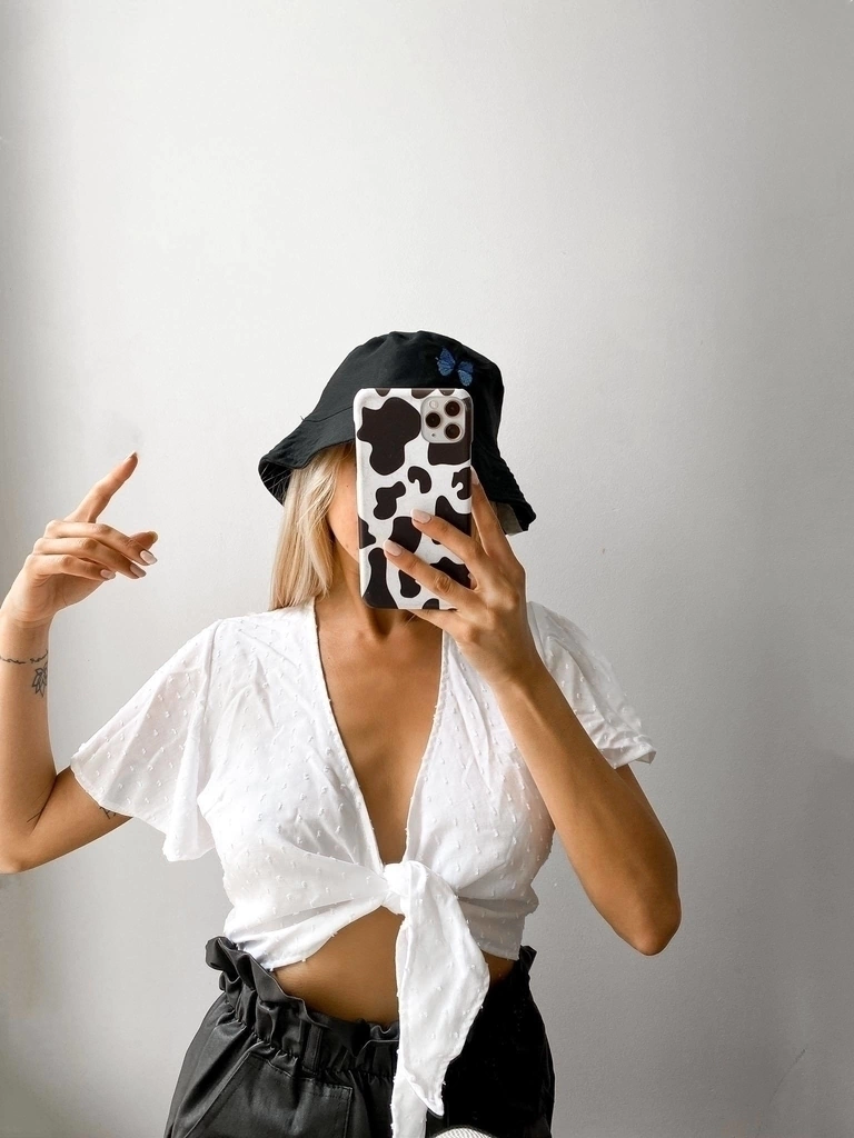 Camisa nudo sin botones en tela plumeti con mangas cortas voladito.