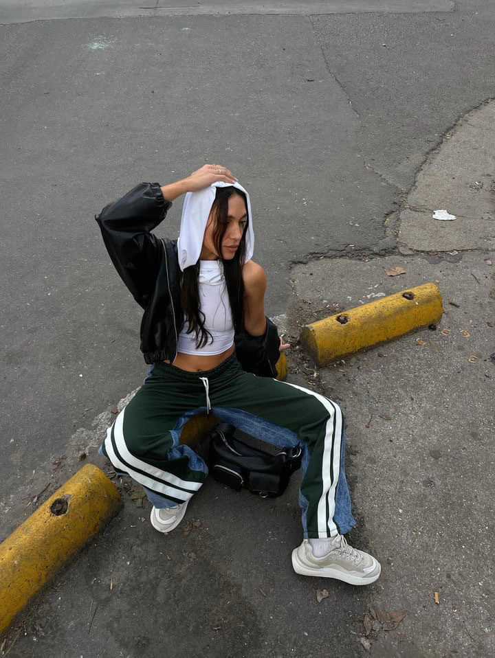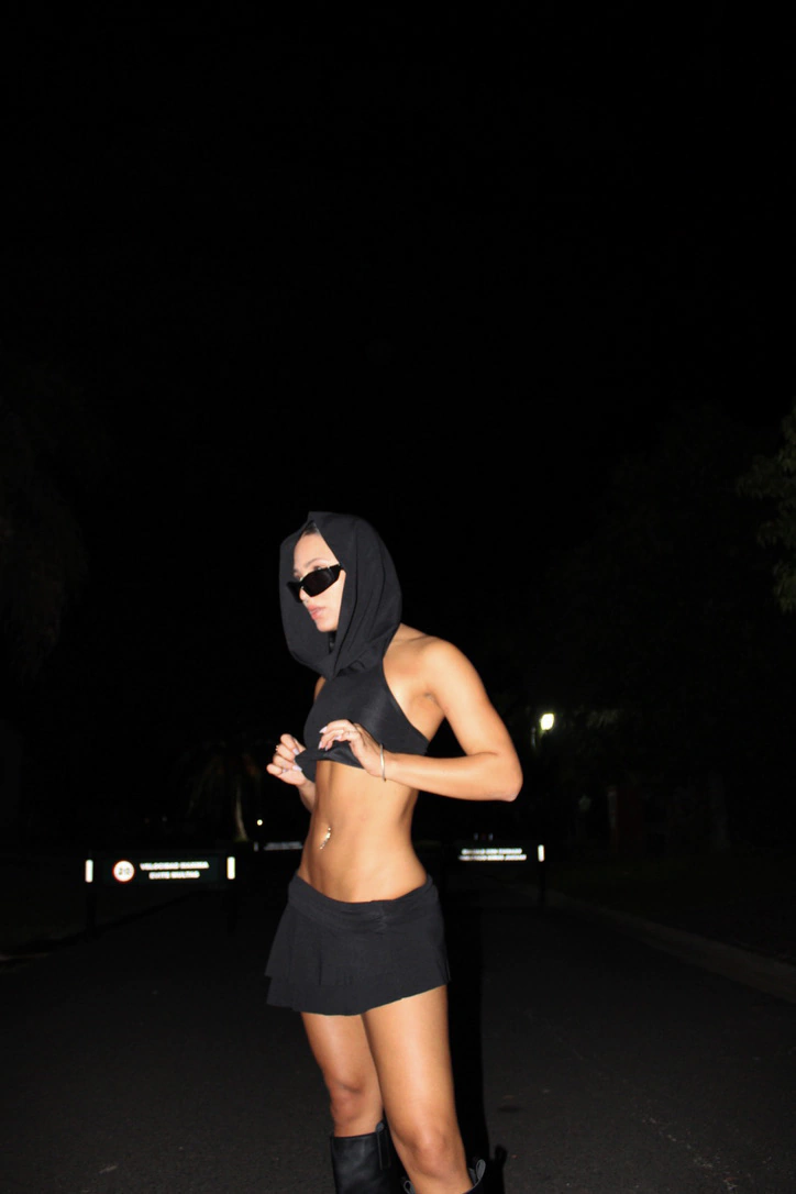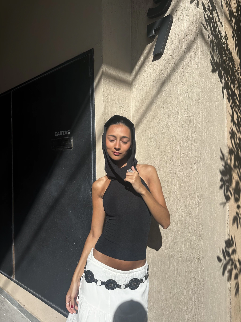 Top en tela microfibra con capucha forrada embolsado con misma estampa