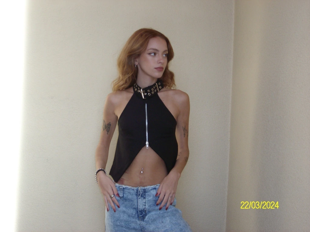Top algodón grueso con abertura .Detalle de cierre y ojalillos en el cuello con cierre