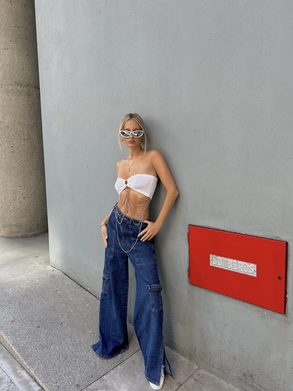 Top strapless con argolla delantera y detalle de cadenas en torso con ganchito en espalda .