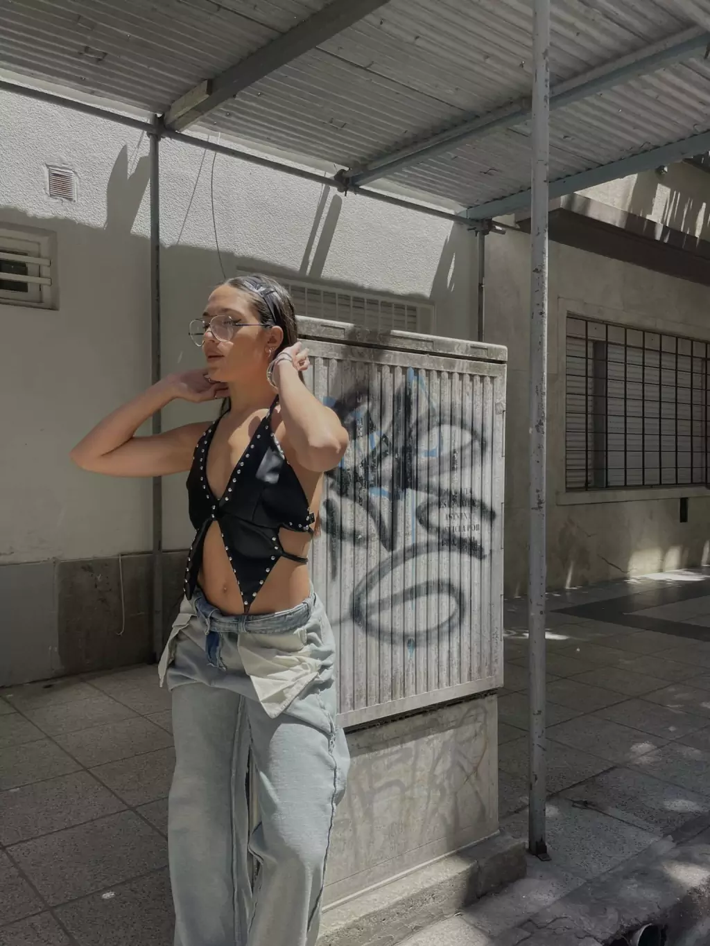 Top para atar cuello y espalda terminacion en pico ,efecto mariposa. Detalle de tachas en todo el contorno del top