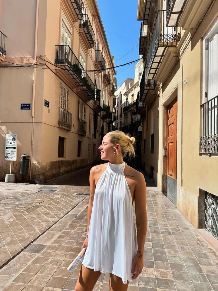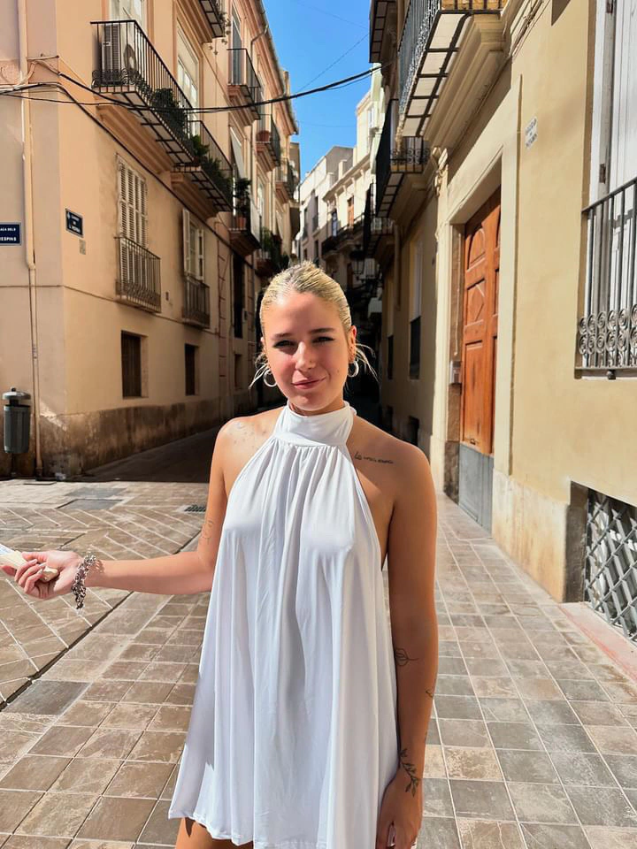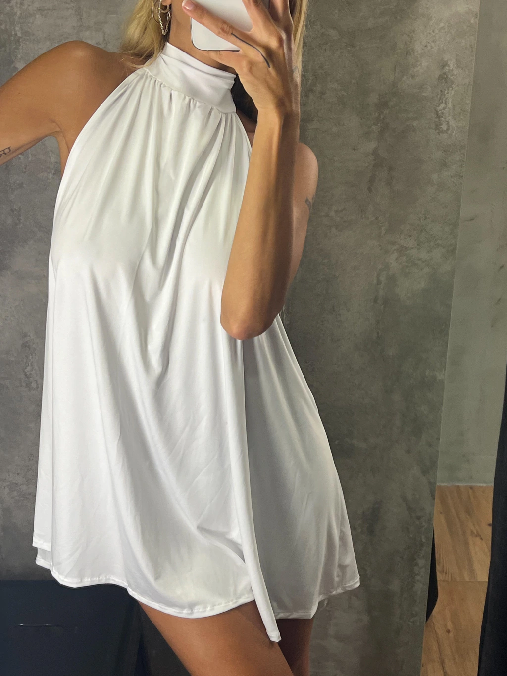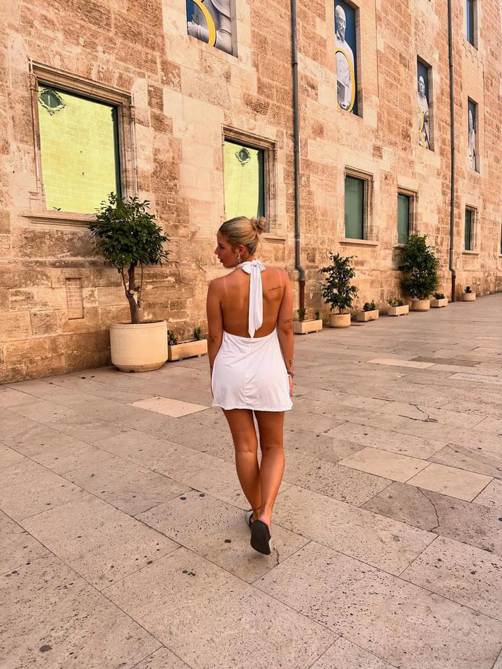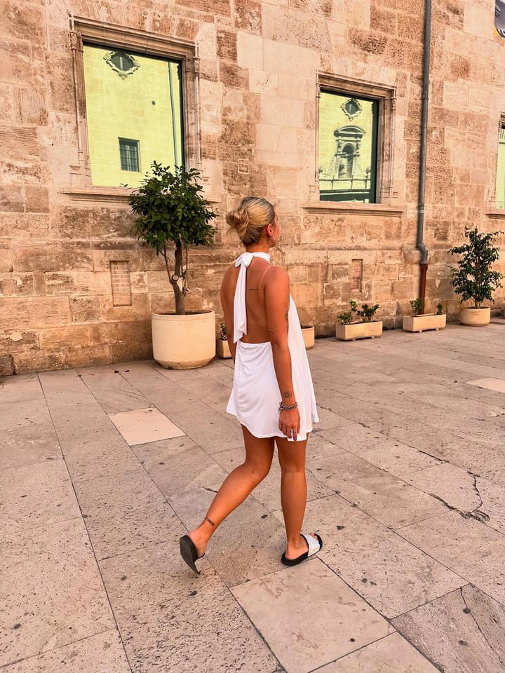 Vestido en seda fria con un poco de cola ,cuello choker para atar con espalda descubierta.